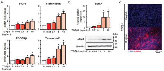 Cancer associated fibroblast (CAF) marker expression in transforming growth factor beta 1 (TGFβ1) treated HMF3S cells. Serum starved HMF3S cells were stimulated with either TGFβ1 (0.01, 0.1, 1, or 10 ng/mL) or vehicle control (0 ng/mL) for 48 h prior to assessing marker. (a) TGFβ1 treatment increased mRNA levels of CAF-associated genes fibroblast activation protein-α (FAPα), platelet-derived growth factor receptor-β (PDGFR β), fibronectin and tenascin-C compared with vehicle at the indicated concentrations. (b) Representative immunoblot and densitometry showing significant induction of α-smooth muscle actin (αSMA) protein compared with vehicle at 1 and 10 ng/mL TGFβ1. (c) Representative immunofluorescence images showing an upregulation of αSMA protein (red) compared with vehicle control. Nuclear (DAPI) staining is also indicated (blue). (a,b) Data are represented as means ± SD from three independent experiments; * p < 0.05 from post-hoc Dunnett’s multiple comparison test after one-way ANOVA revealed significant effect of treatments.