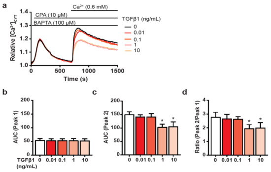 As SOCE is the predominant Ca2+ influx pathway in non-excitable cells [37,38] and is remodelled in a variety of cancer types and cellular transformations [10,11,36], we sought to determine whether SOCE was altered in HMF3S cells following induction of a CAF-like phenotype. To assess this, we initiated SOCE by first depleting the endoplasmic reticulum (ER) Ca2+ stores using cyclopiazonic acid (CPA) to inhibit the sarco/endoplasmic reticulum Ca2+ ATPase (SERCA) under conditions of extracellular Ca2+ chelation with 1,2-bis(o-aminophenoxy)ethane-N,N,N′,N′-tetraacetic acid (BAPTA). Following the initial depletion of the ER Ca2+ stores, SOCE was assessed by addition of extracellular Ca2+. The initial CPA-mediated increase in [Ca2+]CYT, representing store emptying, did not differ between HMF3S-CAF and HMF3S cells, as assessed by the area under the curve (AUC) of peak 1 (Figure 2a,b) suggesting that CAF activation does not result in a change in ER store capacity. However, SOCE was significantly reduced at both 1 and 10 ng/mL TGFβ1 treatment as measured by the [Ca2+]CYT increase following Ca2+ re-addition (AUC of peak 2) (Figure 2c) and the ratio of Ca2+ influx to Ca2+ store depletion (AUC peak 2 to peak 1) (Figure 2d). These results indicate remodelling of SOCE following TGFβ1-mediated induction of a CAF-like phenotype in HMF3S cells.