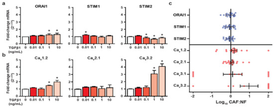Calcium channels and channel regulators are differentially expressed in CAFs. (a,b) Serum starved HMF3S cells were stimulated with either TGFβ1 (0.01, 0.1, 1, or 10 ng/mL) or vehicle control (0 ng/mL) for 48 h prior to RNA isolation. mRNA levels of SOCE channels and channel regulators; (a) Orai1, stromal interaction molecule 1 and 2 (STIM1, and STIM2) and (b) voltage-gated calcium channels (VGCCs); CaV1.2, CaV2.1, CaV3.2, were assessed using quantitative RT-PCR. Values are expressed as fold change relative to vehicle control. Data are represented as mean ± SD from three independent experiments; * p < 0.05 from post-hoc Dunnett’s multiple comparison test after one-way ANOVA revealed significant effect of treatments. (c) Ratio of mRNA of selected calcium channels and channel regulators in paired patient CAFs and normal breast fibroblasts (NFs). Values ± 2 indicate mRNA was not detected in either the CAF or NF sample.
