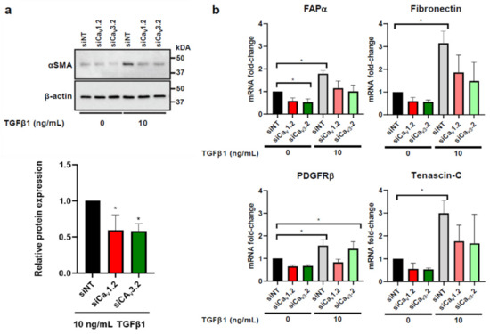 Effect of CaV1.2 and CaV3.2 silencing on TGFβ1-induced CAF marker expression in HMF3S cells. (a) Representative immunoblot and densitometry data showing significant downregulation of αSMA protein expression in the presence of siCaV1.2 and siCaV3.2. (b) TGFβ1 treatment increased mRNA levels of CAF-associated genes FAPα, PDGFRβ, fibronectin, and tenascin-C compared with vehicle. siCaV1.2 and siCaV3.2 reduced induction of FAPα, fibronectin, and tenascin-C while PDGFR-β induction was inhibited with siCaV1.2 but not siCaV3.2. Data are represented as mean ± SD from three independent experiments; * p < 0.05 from post-hoc Dunnett’s multiple comparison test after one-way ANOVA revealed significant effect of treatments.
