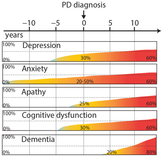 Depression is a common neuropsychiatric disorder of PD. The diagnosis is based on standard criteria [7], reported in the Diagnostic and Statistical Manual of Mental Disorders (DSM V). These criteria include depressed mood, decreased feelings of pleasure, loss or gain in appetite, insomnia or hypersomnia, psychomotor agitation or retardation, loss of energy, excessive or inappropriate guilt, decreased ability to think or concentrate and recurrent thoughts of death [8]. Different types and severity of depression disorders are seen in PD patients such as minor depression (patients presenting at least two of the nine criteria), major depression (patients presenting five to nine criteria) or persistent depressive disorder (major depressive disorder lasting for at least two years). Moreover, depression can precede motor symptoms [9] appearing more commonly in PD patients five years before the onset of motor symptoms than in age-matched controls [10]. Up to 70% of patients could develop depression, depending on the criteria used [7,11] (Figure 1).