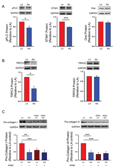 Ca2+ signaling pathway on the diversity of the collagen production capability between the cultured passage 1 (P1) left atrial (LA) and right atrial (RA) fibroblasts from healthy rats. (A) Photographs and averaged data of the phosphorylated phospholipase C (pPLC, n = 5 independent experiments), stromal interaction molecule 1 (STIM1, n = 5 independent experiments) and Orai (n = 5 independent experiments) expression of LA and RA fibroblasts. (B) Photographs and averaged data of the transient receptor potential canonical (TRPC) 3 (TRPC3, n = 5 independent experiments) and TRPC6 (n = 5 independent experiments) expression of LA and RA fibroblasts. (C) Photographs and averaged data of the pro-collagen type I (n = 5 independent experiments) and pro-collagen type III (n = 5 independent experiments) expression of LA and RA fibroblasts with or without a Ca2+/calmodulin-dependent protein kinase II (CaMKII) inhibitor (KN93, 10 μmol/L) for 48 h. GAPDH was used as a loading control. * p < 0.05, ** p < 0.01, *** p < 0.005.