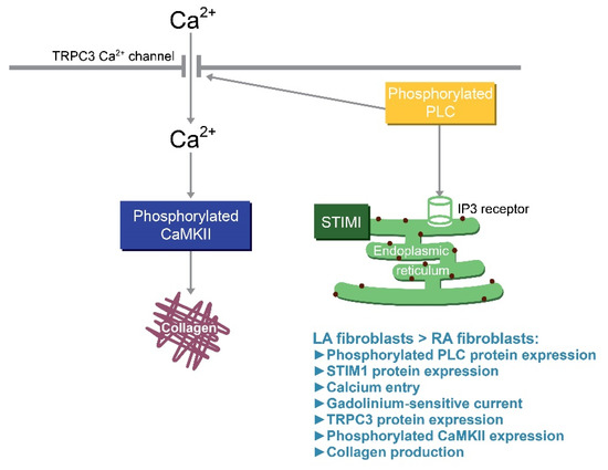 CaMKII, triggered by Ca2+/calmodulin-induced auto-phosphorylation, is a downstream messenger of the Ca2+ signaling pathway [64]. CaMKII activation contributes to pathological cardiac remodeling as the expression is upregulated in patients with AF or HF [65,66]. CaMKII activation augments the collagen production in cardiac fibroblasts [67]. Moreover, genetically knocking-down CaMKII or a treatment with KN93 was shown to reduce myocardial fibrosis in mice with pathological remodeling [68,69]. KN93 can also inhibit the proliferation, collagen production and pro-fibrotic cytokine production capability of cardiac fibroblasts [67]. Our study showed that EGTA-treated LA and RA fibroblasts had similar levels of phosphorylated CaMKII. LA and RA fibroblasts had a similar collagen production capability upon KN93 treatment suggesting that a higher Ca2+ influx induced the CaMKII signaling pathway further, thereby activating the augmented pro-fibrotic cellular activity of LA fibroblasts. Figure 6 shows the proposed mechanism that contributed to the differential collagen production in LA and RA fibroblasts. The diversities of phosphorylated PLC signaling and the expression of TRPC3 and STIM1 activated different levels of Ca2+ influx resulting in a different phosphorylated CaMKII expression and collagen production between LA and RA fibroblasts.
