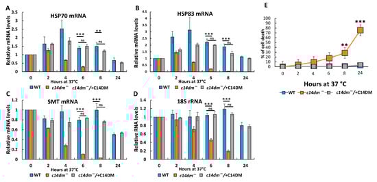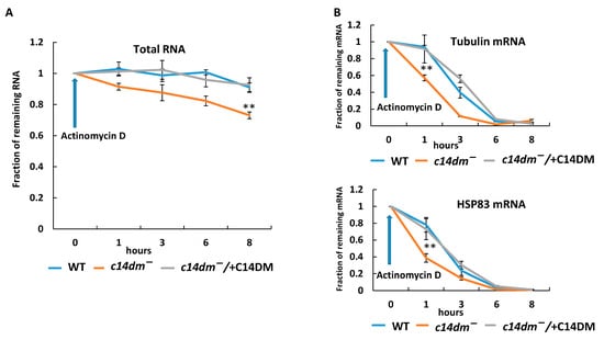 3.3. RNA Degrades Faster during Heat Shock and the Induction of Heat Shock Response Is Compromised in c14dm−
