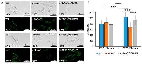 3.6. Intensity of ER Staining Is Compromised in c14dm− under Heat Shock