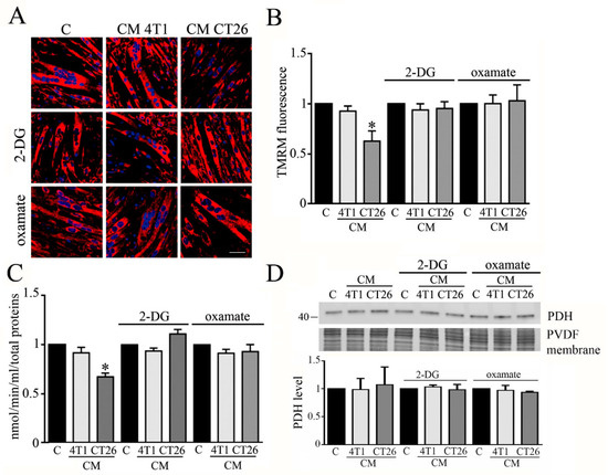 Analysis of mitochondrial membrane potential and PDH in myotubes treated with CMs contained 2-DG or oxamate. Four-day-differentiated myotubes were treated with CMs for 24 h or maintained in differentiating medium as C (control). Where indicated, 2-deoxy-glucose (2-DG) (1 mg/mL final) or oxamate (75 mM final) was added to the media. (A) Mitochondria have been labeled with TMRM (1 µm final) and immediately analyzed under confocal microscope. Representative images of myotubes labeled with TMRM. Mitochondria appear red, while nuclei are blue due to DAPI staining. (B) TMRM fluorescence reported as the mean fluorescence in at least ten randomly chosen fields. Scale bar: 50 µm. (C) PDH activity. PDH activity measured as nmol/min/mL is normalized by using total protein content in each sample. (D) PDH immunoblot. PDH level, reported in the bar graph, was obtained by using Coomassie-stained PVDF membrane for normalization. All the values in the bar graphs are reported as fold increase, considering control myotubes as 1; n = 4; * p < 0.05.