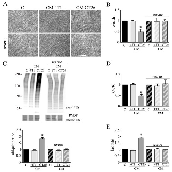 CM CT26 removal restores normal phenotype and metabolism in myotubes. Four-day-differentiated myotubes were treated with 24 h with CM 4T1 or CM CT26. CMs were then removed, and differentiating medium was added to myotubes for additional 48 h. Control myotubes, indicated as C, were treated with differentiating medium throughout the experiment. (A) Microscopic images of myotubes before CM removal (images above) and after the treatment with differentiating medium (images below). Scale bar: 100 µm. (B) Measure of myotube width. (C) Immunoblot of ubiquitinated proteins in myotubes. Normalized ubiquitination level was obtained by using Coomassie-stained PVDF membrane. (D) Oxygen consumption rate (OCR) analysis. (E) Lactate assay. All the values in the bar graphs are reported as fold increase, considering control myotubes as 1; n = 4; * p < 0.05.