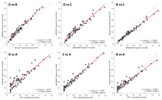 Shows the global Pearson’s cross-correlations among the 4 different branded anti-FXa assays for all the tested plasma samples from heparin treated patients (either with UFH or LMWH), and anticoagulated with citrate or CTAD. Assays for reagents B (IL), C (Siemens), and D (Hyphen BioMed) contain dextran sulfate, whilst the assay for reagent A (Diagnostica Stago) does not. The global ordinary least square correlation coefficient “r” is closer to 1.00, when assays containing dextran sulfate are compared between them.