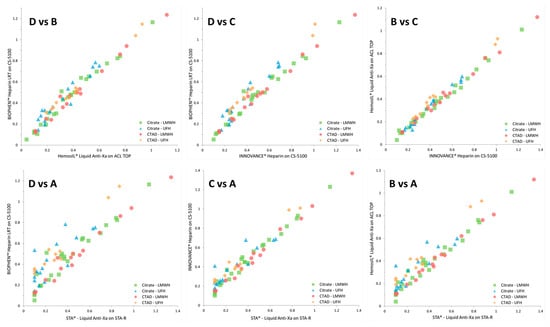 Pearson’s cross-correlations for the comparison of the tested subgroups (UFH-citrate, blue triangles; LMWH-citrate, green squares; UFH-CTAD, orange dots; LMWH-citrate, orange diamonds) with the different reagent-instrument combinations (i.e., reagents A, B, C, and D).