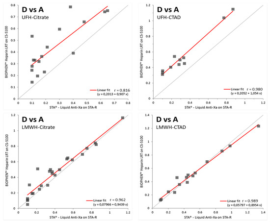 The Pearson’s correlation coefficients are shown in the tables associated with this Figure 3, for the 4 subgroups: LMWH-citrate (n = 25), LMWH-CTAD (n = 15), UFH-citrate (n = 17), UFH-CTAD (n = 11). When r > 0.95, correlation between assays looks acceptable, and measurements differ when r ≤ 0.95. The highest differences are observed for UFH-citrate for the comparisons between anti-FXa reagents containing dextran sulfate (reagents B, C, and D) with that without (reagent A).