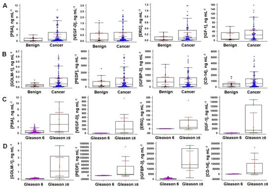 - Jones, A.; Dhanapala, L.; Baldo, T.A.; Sharafeldin, M.; Krause, C.; Shen, M.; Faria, R.C.; Dey, D.; Moghaddam, S.; Watson, R.W.; et al. Detection of Aggressive Prostate Cancer in the Clinic using an 8-Protein Biomarker Panel. Anal. Chem. 2021, 93, 1059–1067. [Google Scholar] [CrossRef]