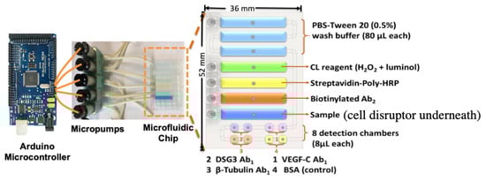- Tang, C.K.; Vaze, A.; Rusling, J.F. Automated 3D-Printed Unibody Immunoarray for Chemiluminescence Detection of Cancer Biomarker Proteins. Lab Chip 2017, 17, 484–489. [Google Scholar] [CrossRef]