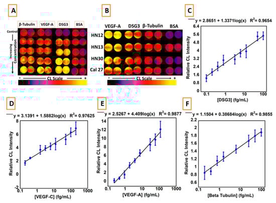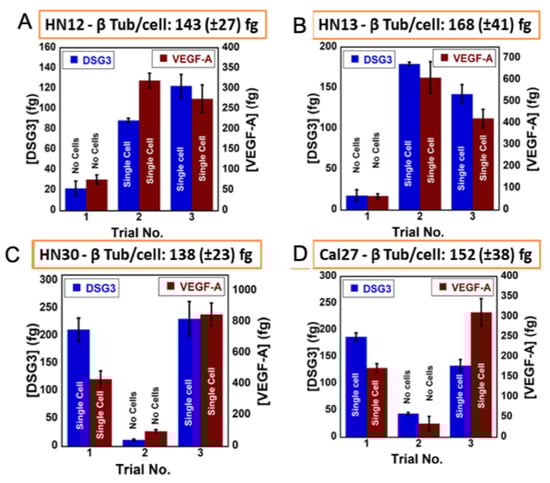 | Oral cancer metastasis | DSG3, VEGF-A, VEGF-C | 3D-printed array with cell disruption device to detect metastasis biomarker DSG3 at single cell level | LODs 0.10 fg/mL for DSG3, and 0.20 fg/mL for VEGF-A, VEGF-C and β-Tub [43] |