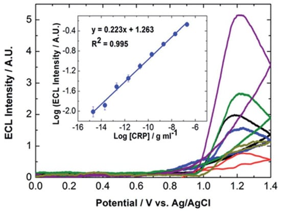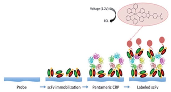 - O’Reilly, E.J.; Conroy, P.J.; Hearty, S.; Keyes, T.E.; O’Kennedy, R.; Forster, R.J. Electrochemiluminescence Platform for the Detection of C-Reactive Proteins: Application of Recombinant Antibody Technology to Cardiac Biomarker Detection. RSC Adv. 2015, 5, 67874–67877. [Google Scholar] [CrossRef] [Green Version]
