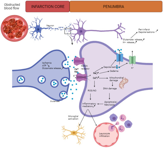 Overview of key events in the ischemic cascade: Ischemic stroke is caused by a sudden occlusion in the brain–blood supply. This results in irreversible damage of the neurons nearby the blood vessel, the ischemic core. This area is surrounded by the salvageable ischemic penumbra, in which neurons can be rescued if neuroprotective treatment is applied on time. In the core zone neurons, impaired oxygen and nutrient delivery results in a reduced ATP production, which will lead to loss of membrane potential and glutamate release. This will cause an ischemic cascade in neighboring neurons: the excess of glutamate will cause an increase in Na+ and Ca2+ influx, leading to cell swelling (edema) and depolarization, which will trigger K+ efflux and glutamate release. In addition, the increase in intracellular Ca2+ will also lead to mitochondrial damage as well as ROS and NO formation, both events causing mitochondrial damage and, thus, apoptosis and necrosis. This increased oxidative stress as well as the necrotic/apoptotic events lead to the secretion of inflammatory mediators, which exacerbate a negative effect of microglial activation and infiltration of native immune cells, such as neutrophils and macrophages [25,26]. Figure created with biorender.com (accessed on 1 May 2021).