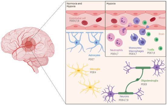 Overview of the most important cell types involved in the neuroinflammatory reaction of ischemic stroke pathophysiology and their expression of cAMP-specific phosphodiesterases (PDEs). Endothelial cells and neurons are found to express PDE4, 7, and 8, while astrocytes only express PDE7 and oligodendrocytes PDE8. PDE4 and 7 are both found in native immune cells, such as neutrophils and monocytes/macrophages, while T cells express PDE7 and 8. Microglia, which are considered the resident immune cells of the brain, possess PDE4. Figure created with biorender.com (accessed on 1 May 2021).