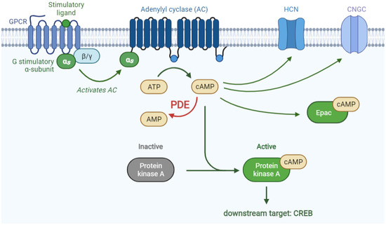 cAMP signaling pathway. Upon binding of a stimulatory ligand to a G-protein coupled receptor (GPCR), adenylyl cyclase (AC) is activated, subsequently stimulating the conversion of ATP to cAMP. cAMP can then activate its downstream targets including protein kinase A (PKA), hyperpolarization-activated cyclic nucleotide regulated channel (HCN), cyclic nucleotide-gated channel (CNGC), and exchange factor directly activated by cAMP (Epac). Activated PKA on its turn activates its downstream target cAMP response element bound protein (CREB). cAMP-specific phosphodiesterases (PDEs) catalyze cAMP to AMP. Figure created with biorender.com (accessed on 1 May 2021).