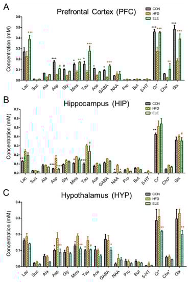 Comparison of mouse brain metabolites quantitated by 1H NMR spectroscopy. (A–C) Concentrations of cerebral metabolites in mouse prefrontal cortex (PFC) (A), hippocampus (HIP) (B), and hypothalamus (HYP) (C). CON, normal diet; HFD, high-fat diet; and ELE, HFD-induced obese mice under treatment with β-elemene. Cr*, Cr + PCr; Cho*, Cho + PCho; and Glx, Glu + Gln. The results are shown as the mean ± SEM (n = 4). # p < 0.1; * p < 0.05; ** p < 0.01; *** p < 0.001 vs. HFD group (assessed using two-way ANOVA followed by Dunnett’s multiple comparisons, the black color of * # means the differences between the CON and HFD and the red color of * # means the differences between the HFD and ELE).