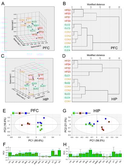 PCA was applied to visualize the overall similarities and differences in cerebral metabolites among the three groups. The PCA score plot for PFC showed that the first two principal components (PCs) explained 60.6% (PC1) and 16.8% (PC2) of the total variance obtained for the three groups (Figure 2E). The HFD group was clearly separated from the other two groups on the PC1 axis. The positive factor loadings of PC1 indicated that the CON and ELE groups were characterized by higher amounts of GABA, Cr*, and Glx than the HFD group (Figure 2F). The PCA score plot for HIP showed that the first two PCs explained 56.5% (PC1) and 21.0% (PC2) of the total variance obtained for the three groups (Figure 2G). The HFD group was separated from the CON group on the PC1 axis but not the ELE group. The positive factor loadings of PC1 indicated that the HFD group had higher amounts of Mins, Tau, and NAA (Figure 2H). However, the HYP did not show clear separation among the three different groups (Figure S5C).