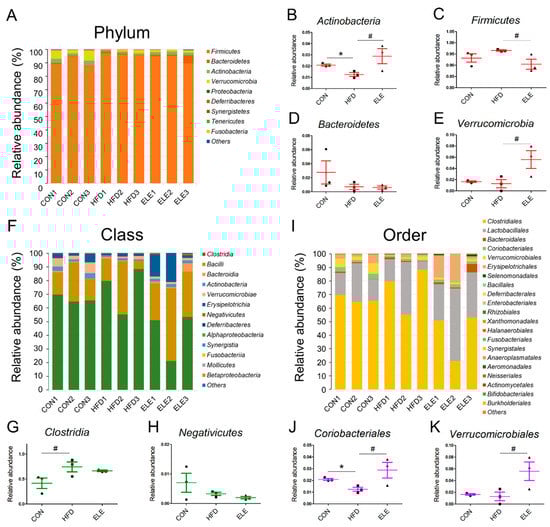Relative abundance of phyla, classes and orders from intestinal microbiota in different treatment groups. (A) Relative abundance of all phyla. (B–E) Relative abundance of Actinobacteria (B), Firmicutes (C), Bacteroidetes (D), and Verrucomicrobia (E). (F) Relative abundance of all classes. (G,H) Relative abundance of Clostridia (G) and Negativicutes (H). (I) Relative abundance of all orders. (J,K) Relative abundance of Clostridiales (J) and Verrucomicrobiales (K). The results are shown as the mean ± SEM (n = 3). # p < 0.1; * p < 0.05 vs. the HFD group (assessed using one-way ANOVA followed by Dunnett’s multiple comparisons).