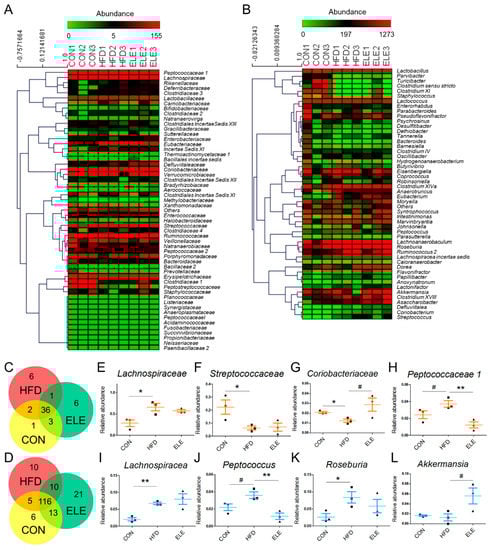 To further explore the fecal microbiota of mice, deeper taxonomic levels, including at the class and order, were analyzed. The relative abundance of all the classes in the samples is shown in Figure 3F. Clostridia, Bacilli, Bacteroidia, Actinobacteria, Verrucomicrobiae, and Erysipelotrichia accounted for the relatively larger proportion (total >90%) of all detected classes. However, the abundance of Clostridia and Negativicutes, which belong to the phylum Firmicutes, was not reversed by β-elemene treatment (Figure 3G,H). At the order level (Figure 3I), the relative abundance of Coriobacteriales, which is an order belonging to Actinobacteria, was significantly reduced in the HFD group and recovered by the β-elemene treatment (Figure 3J). Moreover, increased tendencies of Verrucomicrobiales occurred after β-elemene intervention (Figure 3K). Furthermore, heat maps were used to visualize the large amounts of data from families and genera (Figure 4A,B). According to the Venn diagram in Figure 4C, there were 6 families specific to the ELE group, while it had the highest genus diversity among the three treatment groups (Figure 4D). There were differences in the relative abundance of some families and genera (Figure 4E–L). As shown in Figure 4E,F, HFDs increased the proportion of Lachnospiracea in obese mice, which was accompanied by a reduction in Streptococcaceae. In addition, HFD-reduced Coriobacteriaceae were increased after feeding β-elemene, whereas HFD-increased Peptococcaceae 1 were decreased (Figure 4G,H). At the genus level, HFD feeding enhanced the proportions of Lachnospiracea, Peptococcus, and Roseburia (Figure 4I–K). Following the oral administration of β-elemene, a significant reduction in the relative abundance of Peptococcus and an increase in Akkermansia were observed (Figure 4J,L).