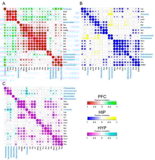 To explore the interaction of cerebral metabolites and intestinal microbiota, a Pearson correlation analysis was performed to calculate the correlation coefficients. The dominant phyla, including Firmicutes, Verrucomicrobia, Actinobacteria, Bacteroidetes, Deferribacteres, and Proteobacteria, and all the selected cerebral metabolites in the PFC, HIP, and HYP are visualized in Figure 5. All the absolute Pearson correlation values used in the following analysis were more than 0.45. In the PFC, Firmicutes had strong negative correlations with Mins, GABA, Cr*, Glx, and Cho*. Bacteroidetes showed higher positive correlations with Glx, Gly, and Ala. Actinobacteria seemed to be associated with Tau, Mins, GABA, Cr*, and Cho* (Figure 5A). In the mouse HIP, Firmicutes were the most abundant bacteria in the mouse intestine and corresponded to Lac and NAA. Both Suc and Ala showed highly positive correlations with Bacteroidetes. In addition, obvious negative correlations were observed between Actinobacteria and Lac, Pro, and But (Figure 5B). Similarly, as shown in Figure 5C, the relative abundance of Firmicutes varied based on the quantity of cerebral GABA, Glx, and Mins, and Actinobacteria was related to Lac and Cr*.