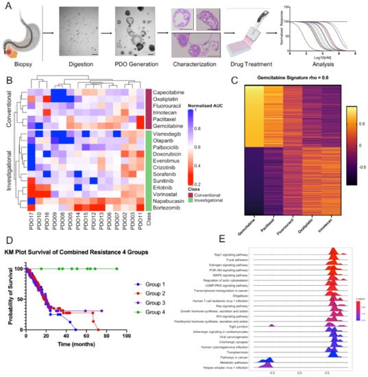 (A) Workflow describing the generation, characterization, and multiplex-drug screening assay of PDOs from EUS FNA biopsies (created with Biorender); scale bar 100 µm (B) Heatmap of normalized area under the curve for all drugs. Analysis reveals heterogeneity in PDO response, both within individual drug treatments and within PDOs. Normalize area under the curve between 0 and 1 (Red—smaller AUC; drug sensitivity, Blue—AUC; drug resistance); (C) Heatmaps of highly correlated gene clusters specific to drug response. For each drug, genes were filtered to include only genes with Spearman rho values rho > |0.6| generating drug-specific gene profiles highly correlated with treatment response. Spearman rho values for each drug profile were then compared between all conventional drugs. Similarities in drug profiles indicate that similar gene expression is correlated with drug response; (D) Kaplan–Meier plot of PDA patients clustered by expression of combined resistance signatures. Clusters are ordered by expression 1–4, 1 being the highest and 4 is the lowest; (E) Ridge plot of KEGG pathways associated with response to Palbociclib treatment. Positively enriched pathways are associated with treatment sensitivity, and negatively enriched pathways are associated with treatment resistance. Pathway analysis was conducted using Gene Set Enrichment Analysis of KEGG pathways based on RNAseq gene expression.