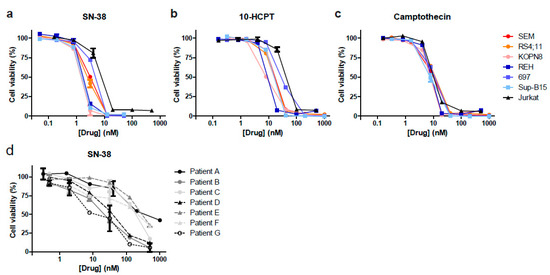 3.2. Camptothecin Derivative SN-38 Most Potently Inhibits ALL Cell Viability