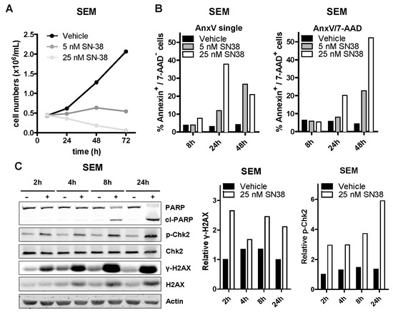 SN-38 induces DNA damage and apoptosis in ALL cells. (A) SEM cell counts over time (8 h, 24 h, 48 h and 72 h) after exposure to vehicle (DMSO), 5 nM or 25 nM of SN-38 (black, dark grey and light grey lines; respectively; n = 3). (B) Percentages of (early and late) apoptotic SEM cells exposed to SN-38. Representative of three separate experiments. (C) Western blots of SEM lysates (left) after exposure to vehicle (-) or 25 nM SN-38 (+) for the indicated time-points. Quantification of the phosphorylated H2AX (γ-H2AX) level relative to total H2AX and relative Chk2 phosphorylation in the SEM samples is shown in the center and right graphs, respectively.