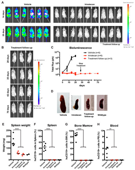 To assess the efficacy of SN-38 in vivo, we used a previously established MLL-rearranged ALL xenograft mouse model [15]. However, since SN-38 is notorious for its poor bioavailability, we instead decided to treat our mice with irinotecan (CPT-11, or Camptosar), which is a pro-drug metabolized into SN-38 in vivo by native carboxylesterases [22,23]. Immunodeficient NSG mice (n = 19) were xenotransplanted with our MLL-rearranged ALL luciferase reporter cell line SEM-SLIEW and equally allocated over vehicle (n = 10) and irinotecan (n = 9; 40 mg/kg) treatment groups, ensuring comparable leukemia burden before treatment (Supplementary Figure S3A). Irinotecan or vehicle was administered 3 times per week via intraperitoneal injections. Interestingly, after 14 and 20 days, bioluminescent imaging revealed clear luminescence in vehicle-treated mice (indicative of progressing leukemia), while no luminescence was observed in irinotecan-treated mice (Figure 4A). As relapses in MLL-rearranged ALL patients often occur early during treatment [1,2], suggesting that small subsets of leukemic cells evade therapy [24], we studied whether the observed ablation of leukemia by irinotecan would be maintained after cessation of irinotecan treatment. Therefore, a subset (n = 6) of the irinotecan-treated mice were sacrificed at day 28 and used to investigate leukemic infiltration of tissues, while the remaining n = 3 irinotecan-treated mice were kept alive without any further treatment (from here on referred to as the treatment follow-up group) (Figure 4A; right), while disease monitoring continued by weekly bioluminescent imaging. Interestingly, the intra-vital images showed no outgrowth of leukemia for up to 42 days off treatment (day 70) in these mice (Figure 4B), indicating no signs of leukemia relapse since cessation of irinotecan administrations. Quantification of the total flux (emitted photons/second) showed a rapid increase in bioluminescence in the vehicle-treated mice, marking progressive leukemia, whereas we observed a lack of signal for mice on the irinotecan treatment arm, which persisted after the end of treatment in the follow-up group, indicating no detectable leukemia relapse (Figure 4C).
