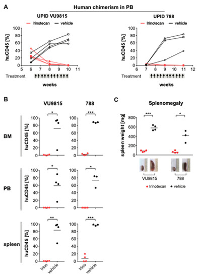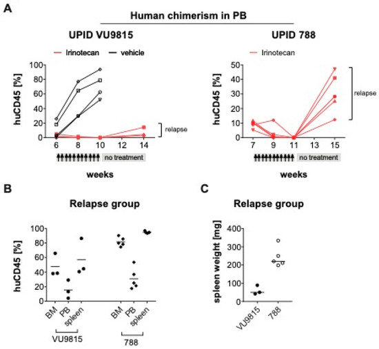 In parallel to the curative set-up, we also established a separate treatment follow-up arm from both PDX models (VU9815, UPID788) to monitor for relapse of the disease, similar to the treatment arms in the cell line model. Irinotecan treatment was stopped after 10 dosages, and the irinotecan-treated mice were kept alive in the treatment follow-up group, whereas the control mice were sacrificed. Here, in contrast to the cell line model, the irinotecan-treated mice of the follow-up group relapsed after 4 weeks following the last irinotecan administration (Figure 7A). The mice were sacrificed, and the tissues analyzed, showing systemic dissemination of human leukemic cells (Figure 7B,C). A possible explanation for these relapses may well be the sporadic presence of human CD45+ leukemic cells in the bone marrow and spleen at the end of treatment, which could act as a cell reservoir inducing leukemia relapse.