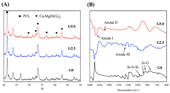 The XRD and FTIR analysis for the various scaffolds is shown in Figure 2. As shown in Figure 2A, all three scaffolds had a PCL peak (21.5o) and multiple Ca2Mg(SiO4)4 peaks, as noted by the inverted triangle signs. These XRD signals of PCL and Ca2Mg(SiO4)4 were similar to those reported by other scholars, thus indicating that there was successful incorporation of Mg2+ ions into the CS [30]. In addition, surface modification with gelatin did not affect or change the original structural components of MgCS, thus making it possible to retain the advantageous characteristics of MgCS. The MgCS scaffold surfaces were modified with gelatin via a chemical cross-linking method with genipin. The FTIR results from Figure 2B confirmed the successful gelatin conjugation with MgCS, as seen from the presence of amide bonds in G2.5 and G5.0. All spectra contained Si-O and Si-O-Si peaks, which is characteristic of the presence of CS. Amide peaks noted at 1750, 1600, and 1300 cm−1 showed that gelatin was successfully incorporated into the MgCS [31].