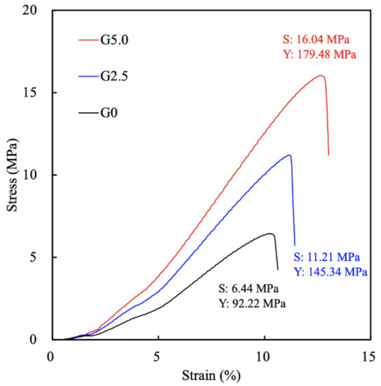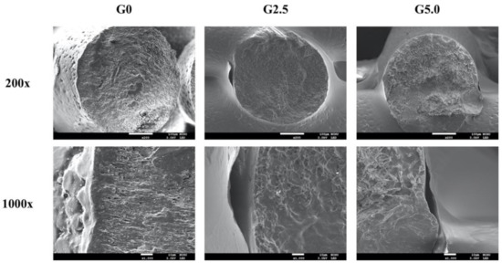 Figure 4 shows the stress–strain curves of the various scaffolds with the Young’s modulus. G0, G2.5, and G5.0 had tensile strengths of 6.44 MPa, 11.21 MPa, and 16.04 MPa, respectively. The addition of gelatin led to an approximate 1.8 to 2.6 times increase in tensile strength. In addition, G0, G2.5, and G5.0 had Young’s moduli of 92.22 MPa, 145.34 MPa, and 179.48 MPa, respectively. It was noted that the mechanical strength of the scaffolds increased exponentially with increases in the gelatin concentration. The improved hydrophilicity did not have any adverse effects on the mechanical strength of the scaffolds; instead, it improved their tensile strength. This result indicated that the appropriate amount of gelatin coating could enhance the mechanical properties of the scaffolds, which was possibly attributable to a better distribution of the mechanical load [24]. Sohrabi et al. proposed that the amide and carboxyl groups in gelatin react with the scaffold, thus leading to increases in tensile strength [35]. The increased mechanical strength allows for better handling of the scaffolds during surgeries and also prevents implant failure due to the native stress on bones.