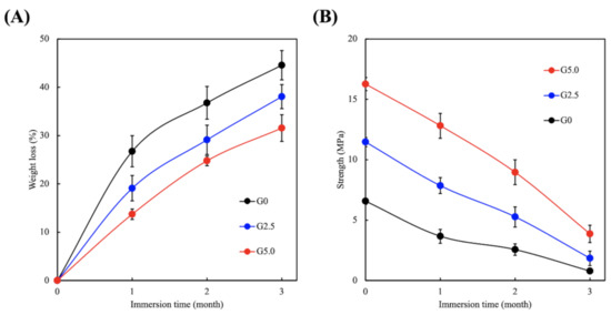 The scaffolds were immersed in PBS for 3 days, and biodegradability was assessed by determining weight loss of the scaffolds. The degradation rate and mechanical strength of the scaffolds after immersion are shown in Figure 5. It can be seen that the weight loss was about 26% (1 month), 35% (2 months), and 43% (3 months) for G0 and 12% (1 month), 22% (2 months), and 27% (3 months) for G5.0 (Figure 5A). In terms of mechanical strength, G0 was 4.6 MPa (1 month), 2.6 MPa (2 months), and 0.5 MPa (3 months), and G5.0 was 13.0 MPa (1 month), 10.0 MPa (2 months), and 5.2 MPa (3 months) (Figure 5B). As for the decreased strength after reaching the maximum point, the degradation process may be a factor, as discussed above [24]. These results indicated that the gelatin modification slows down the degradation of MgCS scaffolds, which makes such scaffolds more appropriate for bone regeneration applications. A good scaffold should degrade at the same rate of regeneration as that of the tissue so as to support tissue regeneration. Furthermore, newly regenerated tissues are generally weaker than healthy tissues, so the scaffold should still be able to provide sufficient mechanical support during the early stages of regeneration [36]. With such concepts in mind, we hypothesized that the gelatin-modified MgCS scaffolds had better potential for supporting bone tissue regeneration as compared to neat MgCS scaffolds.