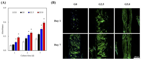 The proliferation rates and F-actin staining of cells cultured on the scaffolds were assessed, as shown in Figure 7. Gelatin has tripeptide arginine-glycine-aspartate (RGD) motifs, which act as receptors for cellular adhesion factors such as integrin. As shown in Figure 7, G0 had a higher proliferation rate as compared to Ctl at all time points, and increasing the concentrations of gelatin led to significantly higher levels of proliferation at all time points. This significance was noted even after 1 day of culture, with G2.5 and G5.0 having 15% and 35% increments of improvement, respectively, as compared to G0. It was hypothesized that increasing the gelatin concentration led to increased RGD motifs, thus leading to enhanced initial cellular adhesion and proliferation. In fact, a MgCS scaffold is already a material that can promote cell growth, mainly because it spontaneously releases Si ions to affect the growth and differentiation of various primary cells [11,41,42]. In addition, the presence of gelatin increased the hydrophilicity and surface roughness, which also had a part to play in up-regulating cellular proliferation. F-actin results in Figure 7B further confirmed that G2.5 and G5.0 had a higher number of cells after 1 and 7 days of culture, as seen from the increased F-actin staining. Furthermore, the cells were spread homogeneously on the surfaces of the scaffolds, and the cells were better adhered onto the surfaces of G2.5 and G5.0 as observed from the F-actin stain. We had previously shown that the surfaces of hydrophobic materials can be positively modified by adding a layer of hydrophilic substrate onto the surfaces. By doing so, we managed to change the critical surface tension values, thus leading to enhanced cellular adhesion and proliferation. In addition, the adhesion and growth of WJMSC in the G5.0 group were better than those in the pure MgCS scaffold (G0), indicating that the gelatin layer provides a biomimetic microenvironment that mimics the natural bone matrix in the 3D-printed MgCS scaffold. Similarly, Martínez-Vázquezet et al. modified the surface of titanium with phosphorylated gelatin, and their results showed that cell adhesion increased with increased concentrations of gelatin [43]. However, our study is the first to incorporate gelatin modification into a 3D-printed MgCS scaffold.
