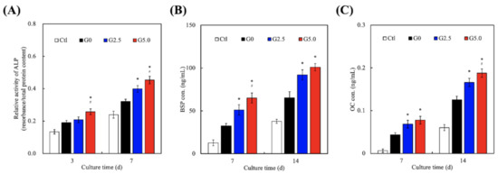 Osteogenesis-specific factors such as alkaline phosphatase (ALP), bone sialoprotein (BSP), and osteocalcin (OC) were assessed, for which the results are shown in Figure 8. It can be observed that G0 again had higher levels of ALP, BSP, and OC at all time points as compared to Ctl. However, G50 had significantly higher levels of ALP, BSP, and OC after 3 and 7 days of culture as compared to G0. G5.0 had 1.3 times (day 3) and 1.8 times (day 7) higher ALP as compared to G0. Similarly, G5.0 had 1.5 times (days 3 and 7) higher BSP and 1.4 times (days 3 and 7) higher OC as compared to G0. The results for G2.5 were approximately in the middle of G0 and G5.0. ALP is known to be involved in matrix mineralization and is specific to osteoblasts. Reports have been made stating that ALP is mainly involved in the post-proliferative phase of osteogenesis, which has been estimated to be approximately days 12–15. OC is also found post-proliferatively at the start of matrix mineralization [44]. In addition, BSP makes up 10% of the non-collagenous protein in the bone matrix and represents late stage osteoblastic differentiation and early stage matrix mineralization [45]. These results confirm the osteogenesis differentiation of WJMSC by the expression of ALP, BSP, and OC, which are considered important osteogenic-related markers of bone cells and further provide a functional demonstration of bone regeneration. Therefore, it could be inferred that G5.0 had more osteo-inductive effects as compared to G2.5 and G0.
