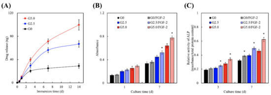 (A) Drug release profiles; (B) proliferation assay; (C) ALP expressions of WJMSC on the gelatin-coated MgCS scaffolds at different time points. * indicates a significant difference (p < 0.05) when compared to G0.