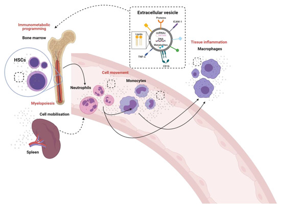 We have demonstrated a role for endothelial cell derived EV in innate immune cell mobilisation from the splenic reserve and in the transcriptional programming of monocytes and neutrophils in the blood, prior to recruitment to tissues [7,27]. Similar transcriptional programming prior to tissue consignment is reported following viral infection e.g., SARs-CoV-2, brain aneurysms and the peripheral monocyte pool shows phenotypic trained immunity following inoculation [28,29,30]. This demonstrates that innate immune cells in a broad range of conditions show transcriptional alterations prior to tissue recruitment. Viral and inoculation programming and training of innate immune cell may be mediated in the peripheral blood by viral components but the manifestation of these transcriptome alterations in sterile tissue injury are poorly described. EV are a ubiquitous means of cell communication, which impact broadly on innate immune function [31]. Here, we focus on the opportunities for immunomodulation of neutrophils, monocytes and their pre-cursor haematopoietic stem and progenitor cells (HSCs) by EV (Figure 1). A better understanding of how immune cells are transcriptionally activated and programmed prior to tissue recruitment by EV and during cellular differentiation could allow the development of targeted therapeutic strategies, e.g., to promote tissue resolution of pro-inflammatory signals and induce tissue repair and regeneration. There is considerable crosstalk between cancer and tumour derived EV, HSCs and their progeny but these have been recently reviewed and will not be discussed in detail here [32].