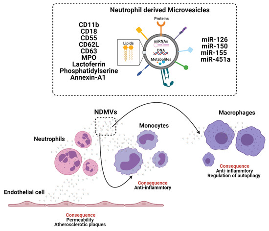Neutrophils are the most abundant leukocyte population in peripheral blood and arrive rapidly at sites of tissue inflammation, infection and injury [33,34,35,36]. Neutrophil functions were thought to be limited due to a diminished transcriptional capacity in mature cells and short lifespans [36]. New single cell (sc)-RNA-sequencing data show diverse transcriptional heterogeneity in neutrophils [35] and studies have reported lifespans of up to a week in vivo [36]. Phagocytosis of apoptotic neutrophils is known to induce anti-inflammatory responses in macrophages and mediates tissue repair and healing in vivo following myocardial infarction [37]. These anti-inflammatory effects are partially mediated by neutrophil proteins such as interleukin-10 (IL-10) [37] and by neutrophil derived EV [38,39,40,41,42,43]. Neutrophils can release at least two sub-classes of EV, termed: neutrophil derived trails (NDTRS), which are generated by integrin mediated interactions by migrating neutrophils in response to vascular wall forces and neutrophil derived microvesicles (NDMV), which are dependent on the PI3K pathway and released by membrane blebbing following neutrophil activation [41,42]. NDTRS and NDMV share common proteins but differ in their inflammatory and anti-inflammatory functions, respectively [44]. Therefore, we will focus on the role of NDMV in cellular programming (Figure 2).