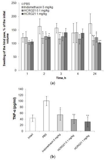 Sintsova, O.; Gladkikh, I.; Klimovich, A.; Palikova, Y.; Palikov, V.; Styshova, O.; Monastyrnaya, M.; Dyachenko, I.; Kozlov, S.; Leychenko, E. TRPV1 Blocker HCRG21 Suppresses TNF-α Production and Prevents the Development of Edema and Hypersensitivity in Carrageenan-Induced Acute Local Inflammation. Biomedicines 2021, 9, 716. https://doi.org/10.3390/biomedicines9070716