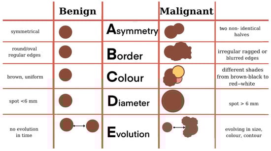 The ABCDE rule refers to the main macroscopical aspects taken into consideration when assessing cutaneous lesions, namely Asymmetry (the two halves of the mole are not identical), Border irregularity (edges are ragged or notched), Color variation (shades of tan, brown, or black and sometimes patches of red, blue, or white), Diameter (>6 mm or >1/4 inch) or Dermoscopic structure, and Evolution (Figure 2) [64]. The same rule can be regarded from a histological point of view, thus becoming the ABCDE(FG) rule, which refers to Asymmetry (silhouette and color imbalance), Buckshot scatter (pagetoid distribution), Cytological atypia, Deep mitosis, Enclosing lymphocytes, Fibrosis, and Gainsaying (=no) maturation [65].