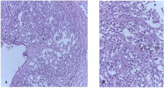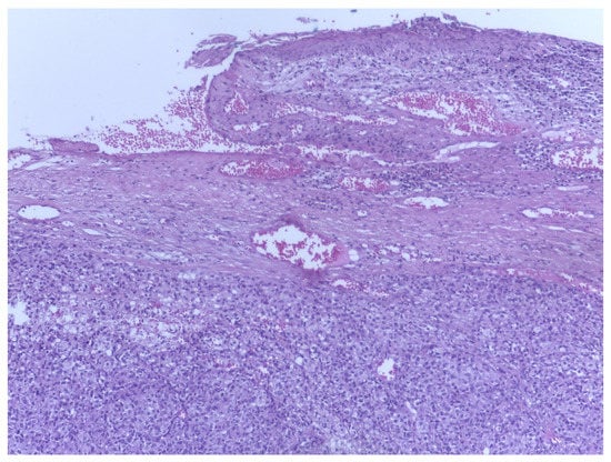 The most common vulvar melanomas subtypes are mucosal lentiginous and nodular melanoma. The characteristic microscopic aspects are represented by impairment of the epidermis, pagetoid spread of melanocytes, or melanocytes organized in nests (Figure 3 and Figure 4) [80]. Usually, melanocytes are variable in size and shape, and are sometimes localized within lymphovascular spaces. Furthermore, they can frequently become confluent and lack maturation, showing atypical mitoses and increased apoptotic activity (Figure 5 and Figure 6) [81]. The presence of an ulcerated tumor is associated with a poor prognosis.