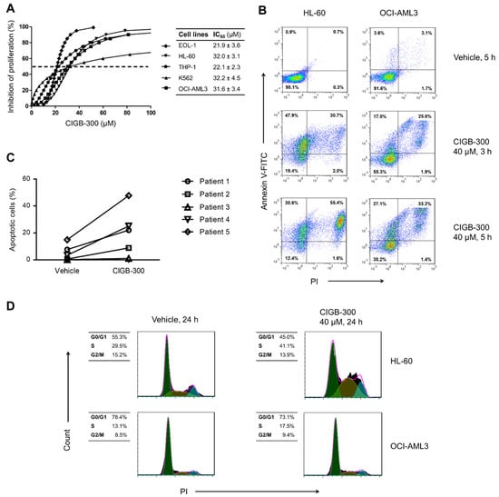 In order to assess the impact of CK2 inhibition in AML cells, we evaluated the effect of CIGB-300 peptide on proliferation and viability of five human cells lines representing multiple stages of myeloid differentiation and AML subtypes (Figure 1). As measured using alamarBlue assay, CIGB-300 exhibited a strong dose-dependent inhibitory effect on proliferation of AML cell lines, with IC50 values ranging from 21 to 33 µM (Figure 1A). Such antiproliferative effect could be explained in part by an impairment of AML cells’ viability since Annexin V-FITC/PI staining indicated that the peptide promoted apoptosis in HL-60 and OCI-AML3 cells and in primary cells from the majority of AML patients’ bone marrow samples (Figure 1B,C).