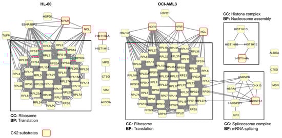 Protein–protein interaction networks associated with CIGB-300 interacting proteins in HL-60 and OCI-AML3 cells. Networks were generated using information gathered from the STRING database and were visualized using Cytoscape. Cellular components (CC) and biological processes (BP) retrieved from the Gene Ontology database are indicated.