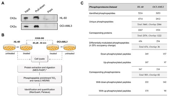Phosphoproteomic analysis of human AML cells treated with the CK2 inhibitor CIGB-300: (A) Immunoblots from in vivo pull-down fractions to detect the interaction between CIGB-300 and CK2α catalytic subunit; (B) Workflow for the exploration of phosphorylation changes induced in HL-60 and OCI-AML3 cells after treatment with CIGB-300. Three biological replicates of each group were evaluated; (C) Number of identified and differentially modulated phosphopeptides in each AML cell line. (*) MED-FASP: multienzyme digestion filter-aided sample preparation [51]. Input: cellular extract, Pull-down: bound fraction, Pass: flow-through fraction.