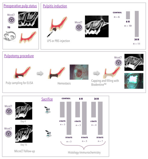 Experimental diagram and distribution of animals during the study. The first box represents the micro-computed tomography (micro-CT) exam of the preoperative pulp status. The second box details the induction of pulpitis after drilling a hole in the two maxillary first molars and the injection of 5 µL of phosphate-buffered saline (PBS) or lipopolysaccharide (LPS) into each tooth. The diagram indicates the division of animals by duration (0, 6 or 24 h) of pulpitis induction. The third box illustrates the pulpotomy procedure and pulp sampling with sterile paper tips for enzyme-linked immunosorbent assay analysis. Hemostasis (represented with a schematic drawing and a photograph) was achieved by injecting sterile saline and applying slight pressure with a sterile cotton pellet. Then, BiodentineTM cement was used to fill the coronal pulp space. A micro-CT exam confirmed the postoperative result. The final box details the distribution of animals by treatment duration before sacrifice, 4 or 15 days, for histological and immunochemical analysis. A final micro-CT exam before sacrifice allowed verification of the impermeability of the obturation. All 27 animals were included in the analysis; no animals were excluded. The sample size was decided using the resource equation method (PMID 24250214), and an error degree of freedom of 22 was considered as indicating an acceptable sample size. Rats were randomly assigned to one of the groups. A numbering strategy was used to minimize potential confusion of animals, while permitting a level of blinding of operators during the experiment.