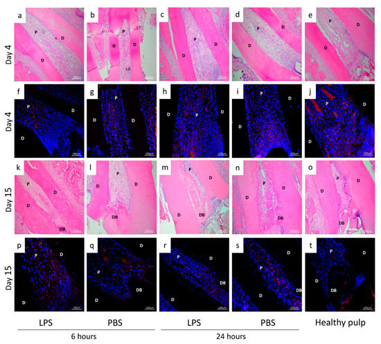 Inflammation analysis by histology and immunochemistry. Hematoxylin-eosin staining (a–e,k–o) and immunofluorescence (CD68 label) (f,j,p,t) analysis of non-inflamed pulp (healthy pulp) and experimental rat pulpitis induced by phosphate-buffered saline (PBS) or lipopolysaccharide (LPS) treatment observed at 4 and 15 days, after 6 or 24 h of induction. Four days after the pulpotomy, hematoxylin and eosin-staining revealed characteristics of inflammation in all groups. More specifically, CD68 immunohistochemistry highlighted more CD68-positive cells after 24 h (LPS/PBS) (h,i) than 6 h (LPS/PBS) of induction (f,g). The labelling is found mainly in the coronal third of the root very close to the cellular degeneration area. Fifteen days after the pulpotomy, the inflammation had resolved in the pulp with 6 h of induction (LPS/PBS) (p,q) and healthy pulp (t). A few macrophage cells remained in the pulp with 24-h induction with PBS/LPS (r,s). D: dentin, P: pulp, CD: cellular degeneration, DB: dentin bridge.