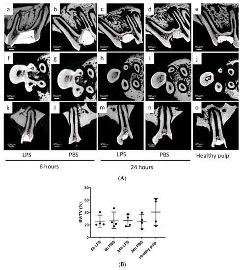 Analysis of mineralized bridge obtained after pulpotomy using tricalcium silicate-based cement by micro-computed tomography. (A): The 3D sections focusing on the reparative dentin bridge, 2 weeks after pulpotomy in inflamed teeth (phosphate-buffered saline (PBS) or lipopolysaccharide (LPS)). Thick well-defined calcified tissue (*) was present at the opening of each root, forming a canal obstruction in the control group (e,j,o) and in the 6-h LPS/PBS groups (a,b,f,g,k,l). The mineralized area seen after 24-h induction (c,d,h,i,m,n) looks more heterogenous than after 6-h induction or in healthy pulp. (B): Quantification (by Bone volume/Total volume % technique) of the mineralized bridge induced by BiodentineTM 15 days after pulpotomy under different conditions. No significant difference of mineralization was observed between healthy pulp and experimental groups.