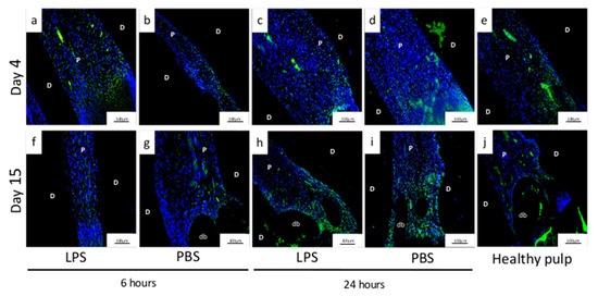 In our study, we detected large numbers of CD68+ monocytes throughout the radicular pulp and particularly in the coronal part at D4, with no differences according to stimulant (LPS/PBS) or with respect to control or by induction duration, but detected far fewer of these cells at D15 in treated animals. CD68 is considered a marker for macrophage lineage cells, and macrophages are immune cells involved in the elimination of pathogens and tissue homeostasis through the clearance of senescent cells and repair after inflammation. Further, it is known that CD68+ monocytes are resident in the DP [38], and their density increases with the progression of caries [39]. Overall, we consider that the reduction in CD68+ cells observed at the later follow-up is suggestive of resolution of the inflammation.