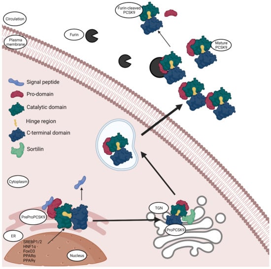 Synthesis and secretion of PCSK9. PCSK9 is synthesised in the endoplasmic reticulum (ER) with the help of transcription factors sterol-response element binding protein (SREBP-1/2), hepatocyte nuclear factor 1α (HNF1α), forkhead box O3 (FoxO3), Peroxisome proliferator-activated receptor α and γ (PPARα and PPARγ). The synthesised PCSK9 is in the form of inactive zymogen, called PreProPCSK9. PreProPCSK9 has five segments: a signal peptide, the pro-domain, catalytic domain, hinge region and the C-terminal domain; the protein then undergoes autocatalytic cleavage in the ER to lose the signal peptide and becomes ProPCSK9. Pro-PCSK9 is then transported to Trans-Golgi Network (TGN), where it interacts with Sortilin, undergoes proteolysis and the mature hetero-dimer PCSK9 is then transported in endosomes and secreted into the circulation. Normally, mature PCSK9 has its pro-domain non-covalently attached, although in circulation it can encounter furin, which then cleaves the pro-domain and releases a smaller peptide into circulation that is less active than the hetero-dimer PCSK9. The figure was created with Biorender.com (accessed on 19 May 2021).